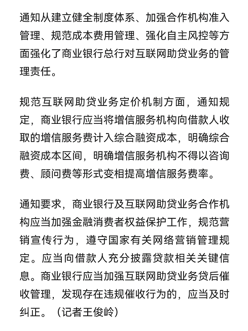 通知从建立健全制度体系、加强合作机构准入管理、规范成本费用管理、强化自主风控等方面强化了商业银行总行对互联网助贷业务的管理责任。